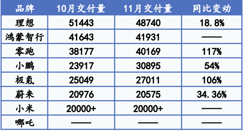 ● 12月1日,多家造车新势力如期公布11月月度成绩单,其中理想和鸿蒙智行依旧位居第一、第二,零跑、小鹏、极氪再度创下销量新高。