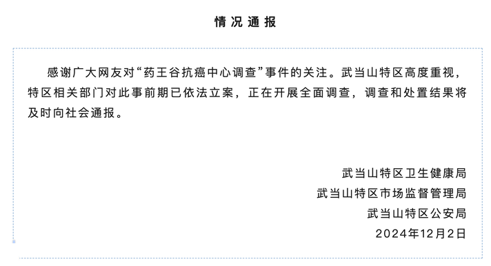 ● 湖北十堰武当山药王谷开诊1个多月15名患者死亡、20人病情加重。12月2日,官方通报“药王谷抗癌中心调查”事件:已依法立案。