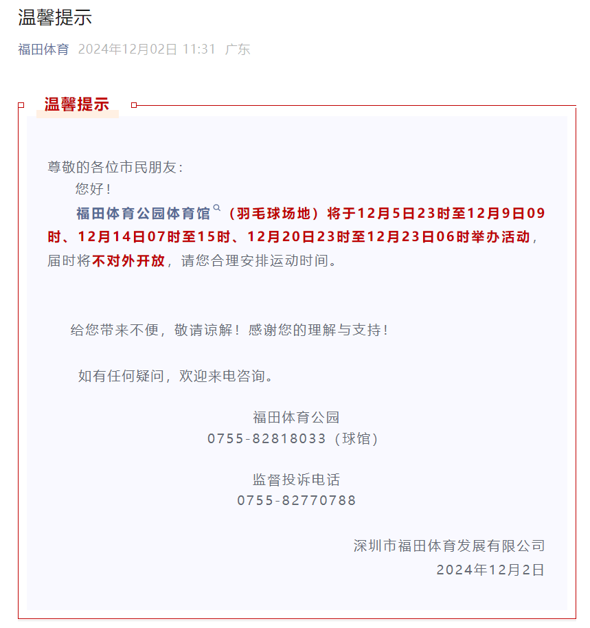 ● 福田: 福田体育公园体育馆(羽毛球场地)将于12月5日23时至12月9日09时、12月14日07时至15时、12月20日23时至12月23日06时举办活动,届时将不对外开放。