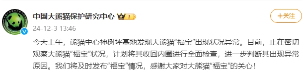 央视网消息:中国大熊猫保护研究中心消息,今天(12月3日)上午,熊猫中心神树坪基地发现大熊猫“福宝”出现状况异常。目前,正在密切观察大熊猫“福宝”状况,计划将其收回内圈进行全面检查,进一步判断其出现异常原因。