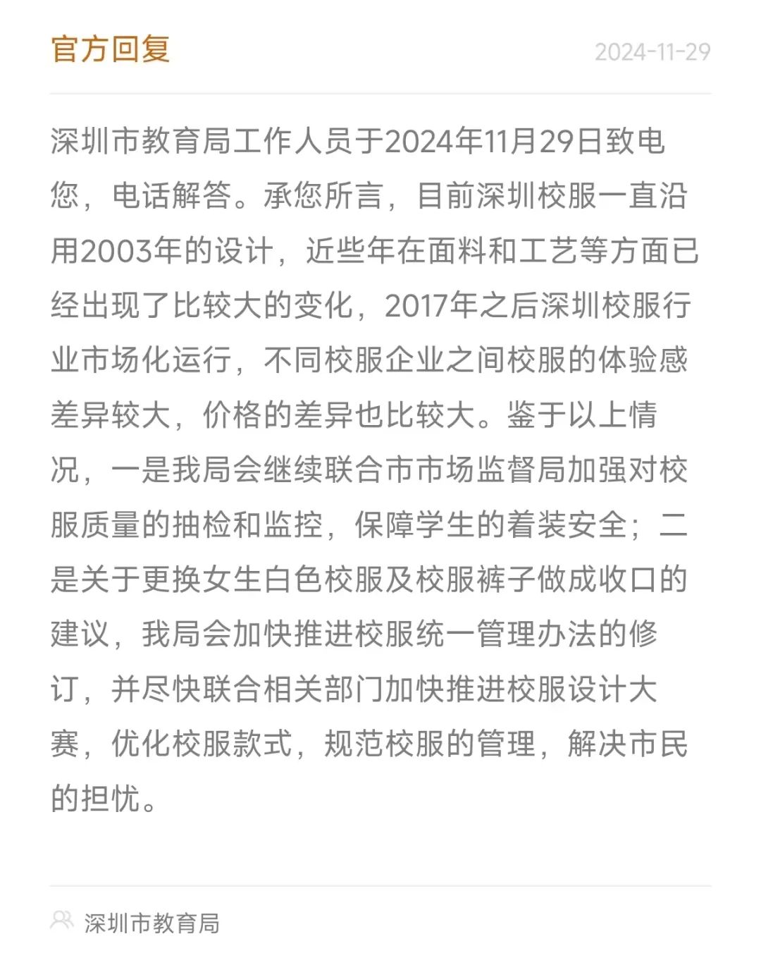 ● 近日,有家长建议深圳小学生校服降价、修改款式,深圳教育局作出回应。详情>>
