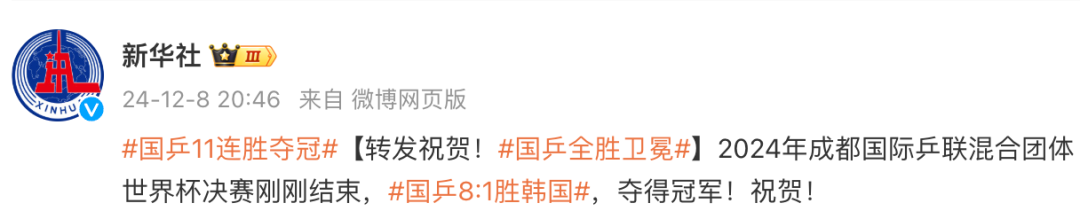 12月8日,2024年国际乒联混合团体世界杯在四川成都迎来收官。在刚刚结束的决赛中,由王楚钦/孙颖莎(混双)、王曼昱(女单)、林诗栋(男单)出战的中国队击败韩国队,以十一场全胜的战绩夺得冠军,成功卫冕。