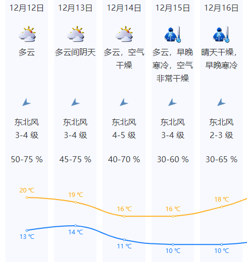 13-15日受不断补充的冷空气影响,气温继续下降,其中13-14日云量较多,温差较小,体感较凉,沿海和高地最大阵风7-8级。