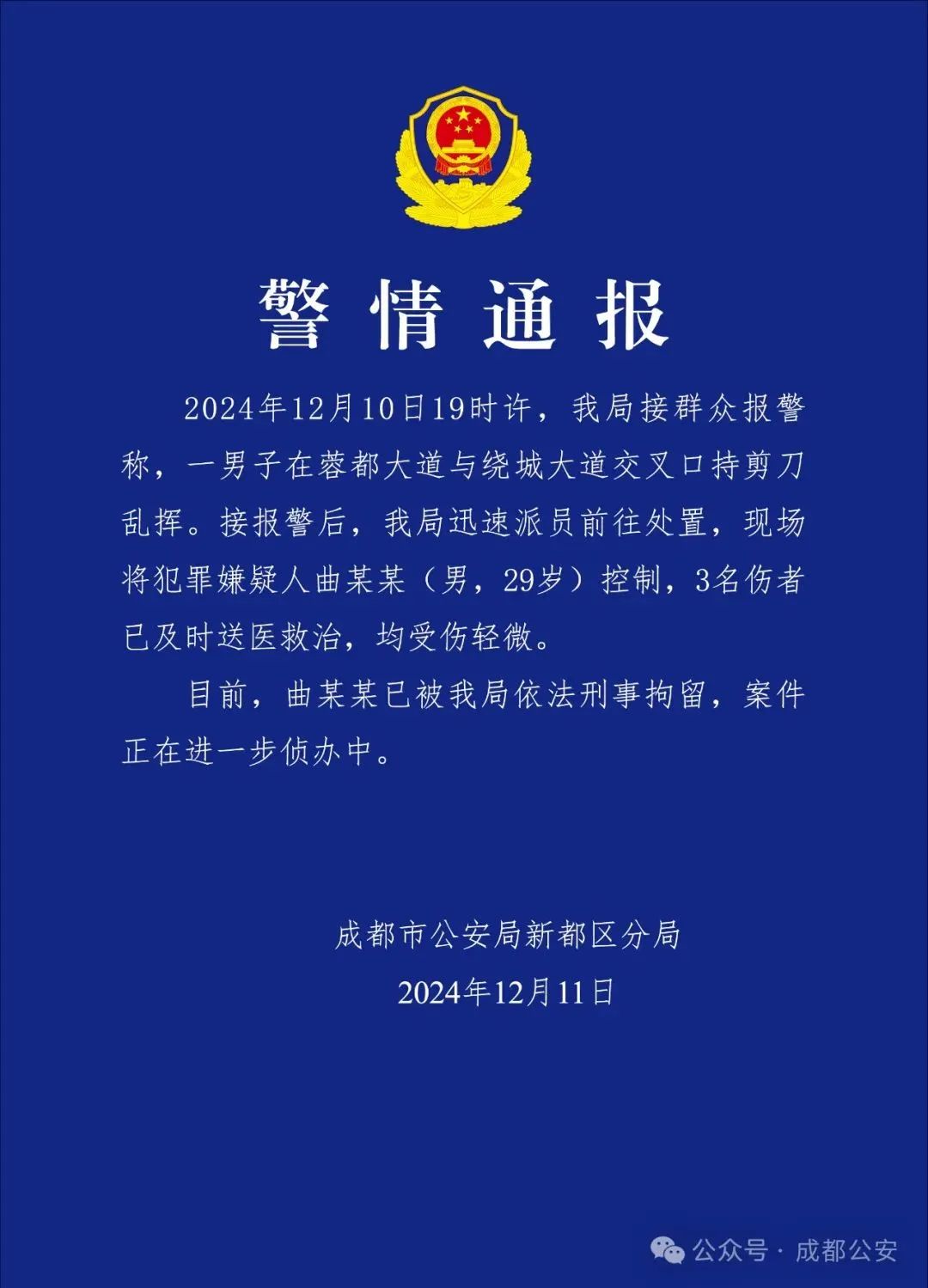 ● 男子成都街头持剪刀伤人,警方通报:3人受伤,嫌犯已被刑拘。