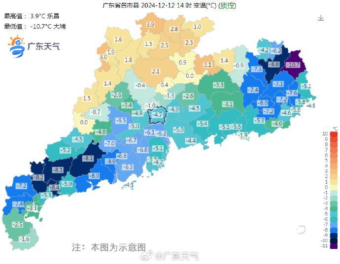 12日14时,清远、韶关北部气温在11~14℃,河源、梅州、珠三角西部气温在15~18℃,其余地区气温18~22℃,最大降幅同比11日下降8~10℃。