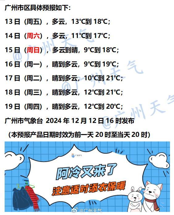 13-14日,广东省大部多云,气温继续小幅下降。最低气温:粤北和珠江三角洲北部5~9℃,南部沿海市县13~16℃,其余市县10~13℃。