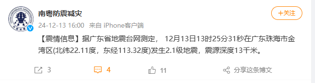 据广东省地震台网测定,12月13日13时25分31秒在广东珠海市金湾区(北纬22.11度,东经113.32度)发生2.1级地震,震源深度13千米。