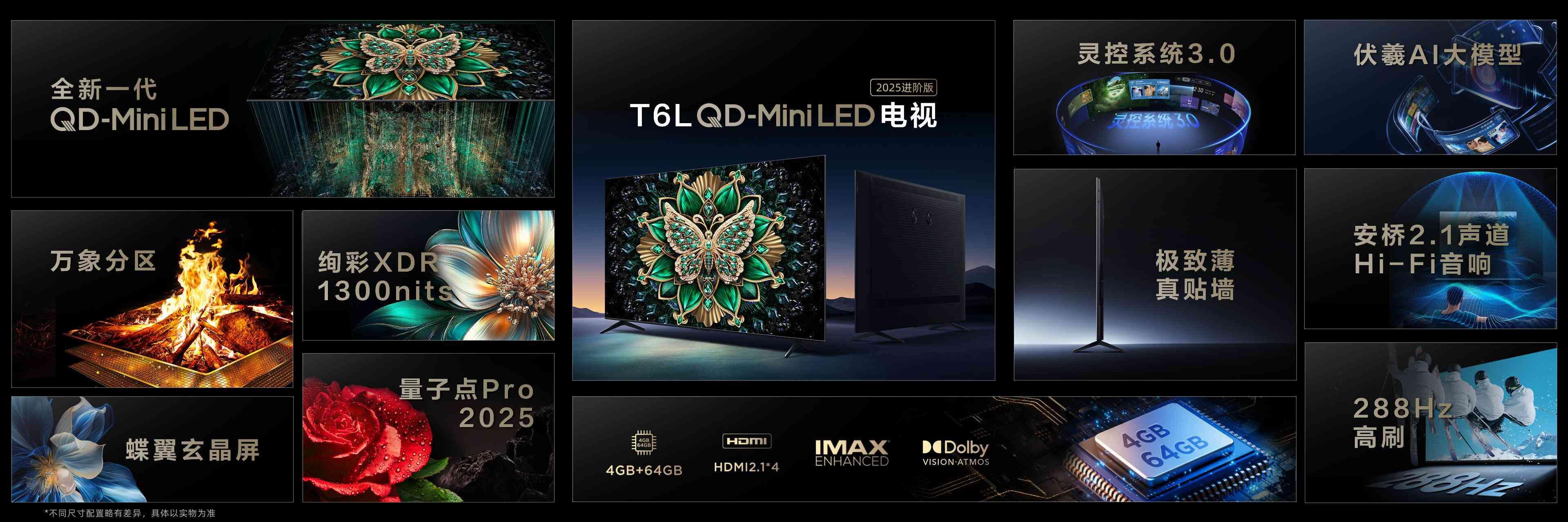 而在此次新技术发布会上亮相的TCL T6L QD-Mini LED电视,除了搭载“万象分区”“绚彩XDR”“量子点Pro 2025”“灵控系统3.0”“伏羲AI大模型”等行业顶尖科技外,还采用拥有超高对比度的蝶翼玄晶屏、2.1声道的安桥Hi-Fi音响、288Hz高刷等硬核配置,极具质价比,将进一步刺激TCL的销量增长,巩固TCL“全球第一”的向好态势。