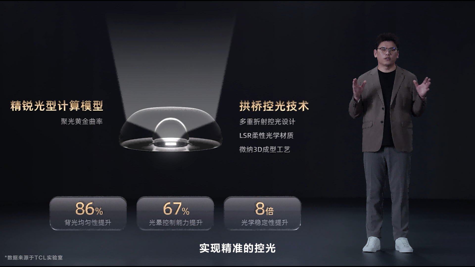 发光芯片的升级,是造就万象分区的第一个环节。TCL将蓝宝石高光晶底升级为超能高光晶底,并以ALD原子级耐蚀工艺实现电视亮度与能效的大幅提升,相较上一代多芯Mini LED芯片亮度提升53.8%,能效提升10%。第二,TCL使用升级版的拱桥控光技术,并采用可靠性更强的LSR柔性光学材质,同时还通过独家精锐光型计算模型,使新一代聚光微透镜在同样的分区数下,带来86%的背光均匀性提升与67%的光晕控制能力提升,更好地塑光型、去光晕,实现精准控光。