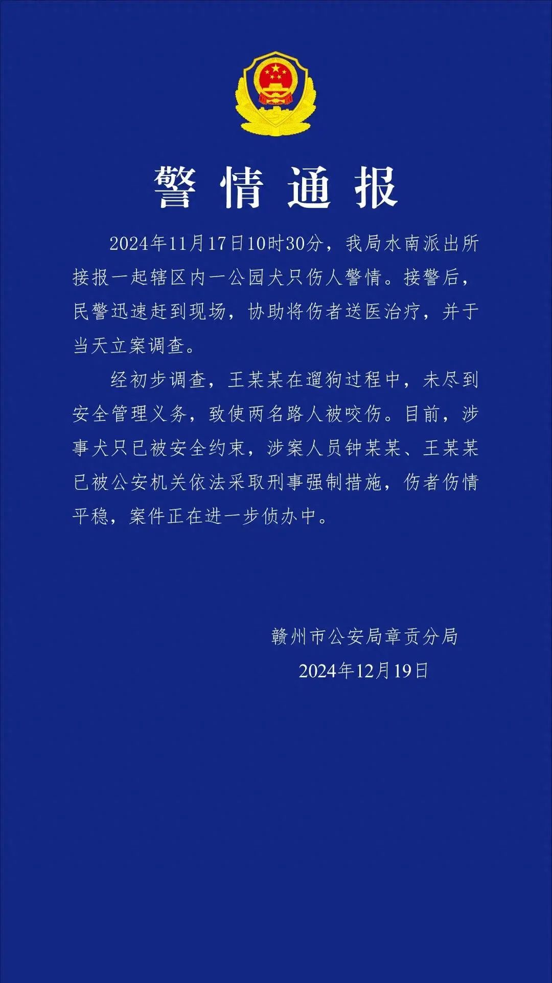 ● 江西警方通报“4条大型犬撕咬母女”:2名涉案人员已被依法采取刑事强制措施。详情>>