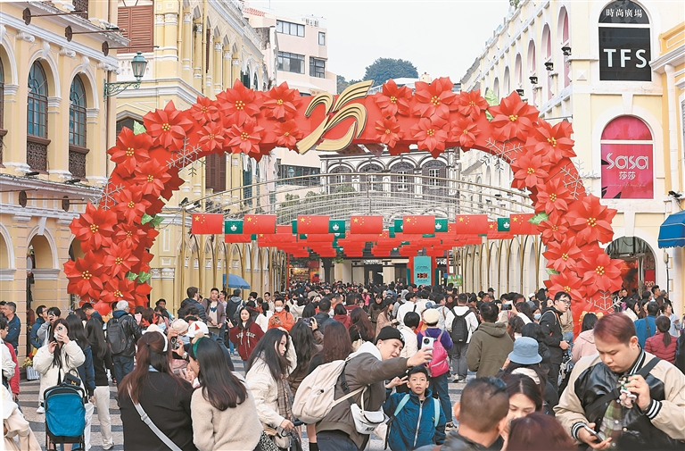 走在12月的澳门街头,到处洋溢着浓厚的节日气氛。张灯结彩、喜气洋洋的景象让每一位市民都沉浸在幸福和喜悦之中。在议事亭前地的板樟堂街,鲜艳的国旗与澳门特别行政区区旗交相辉映,成为市民和游客争相合影的首选背景。大三巴牌坊前,一块庆祝澳门回归祖国25周年的牌匾格外引人注目,彰显了澳门人民对祖国的深厚情感。