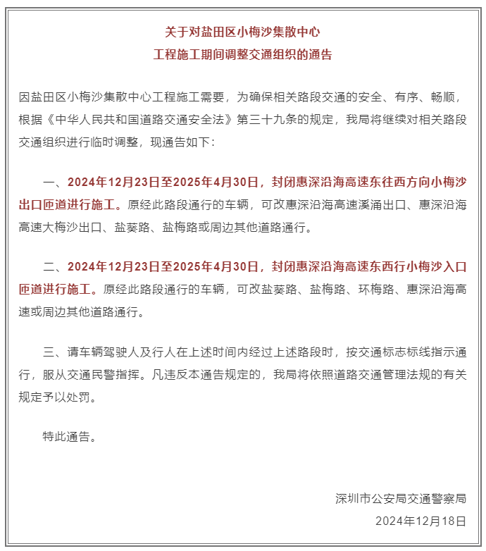 ● 盐田:2024年12月23日—2025年4月30日,小梅沙片区部分高速匝道封闭。