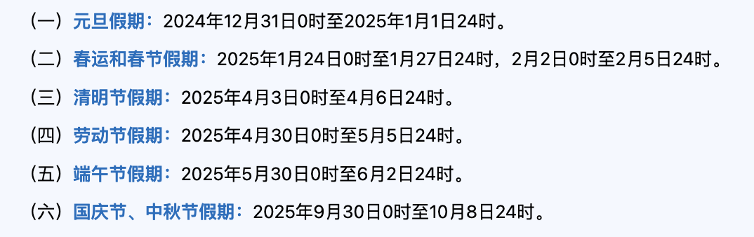 ● 广东交警发布通告:2025年重大节假日和春运高峰期间高速公路禁止危险货物运输车辆通行。禁止通行具体时间安排如下: