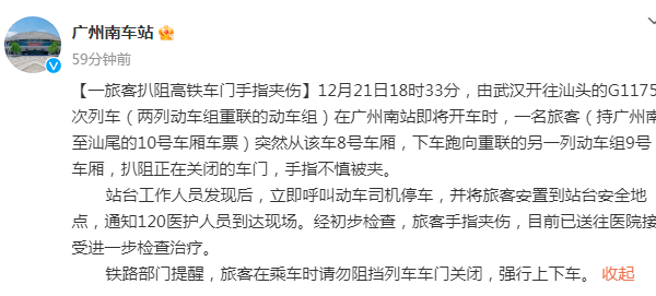 ● 12月21日晚,广州南站通报高铁夹到乘客拖行事件:受伤乘客已送医。