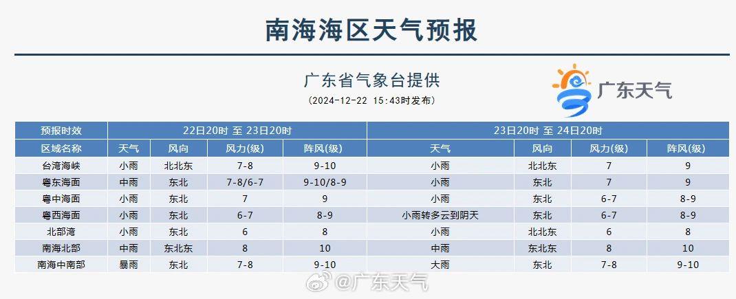 据@广东天气,受南海热带低压和冷空气共同影响,23—24日,粤东海面风力6~8级阵风9级,中西部海面风力6~7级阵风8级;南海大部海面和台湾海峡风力7~9级阵风10级;25日各海区风力趋于减弱。