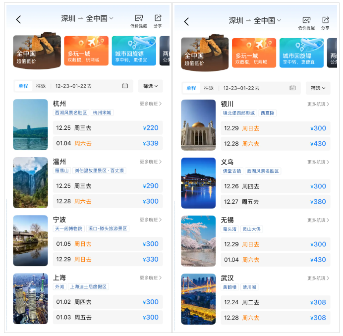 ● 近期从深圳出发,机票价格降幅超7成。