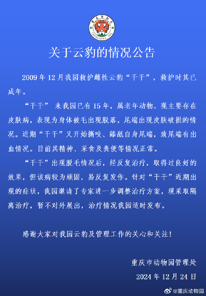 “干干”到重庆动物园已有15年,属老年动物。现主要存在皮肤病,表现为身体被毛出现脱落,尾端出现皮肤破损的情况。近期“干干”又开始撕咬、舔舐自身尾端,致尾端有出血情况。目前其精神、采食及粪便等情况正常。