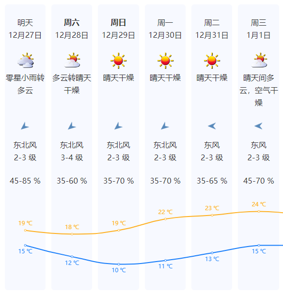 28-29日,渐转晴天干燥天气,最低气温降至10℃左右,早晚体感寒冷,沿海、高地和海区最大阵风7级左右。