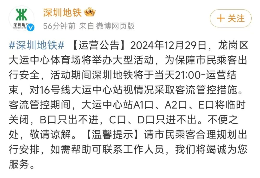 ● 深圳地铁将于12月29日21:00-运营结束,对16号线大运中心站视情况采取客流管控措施。