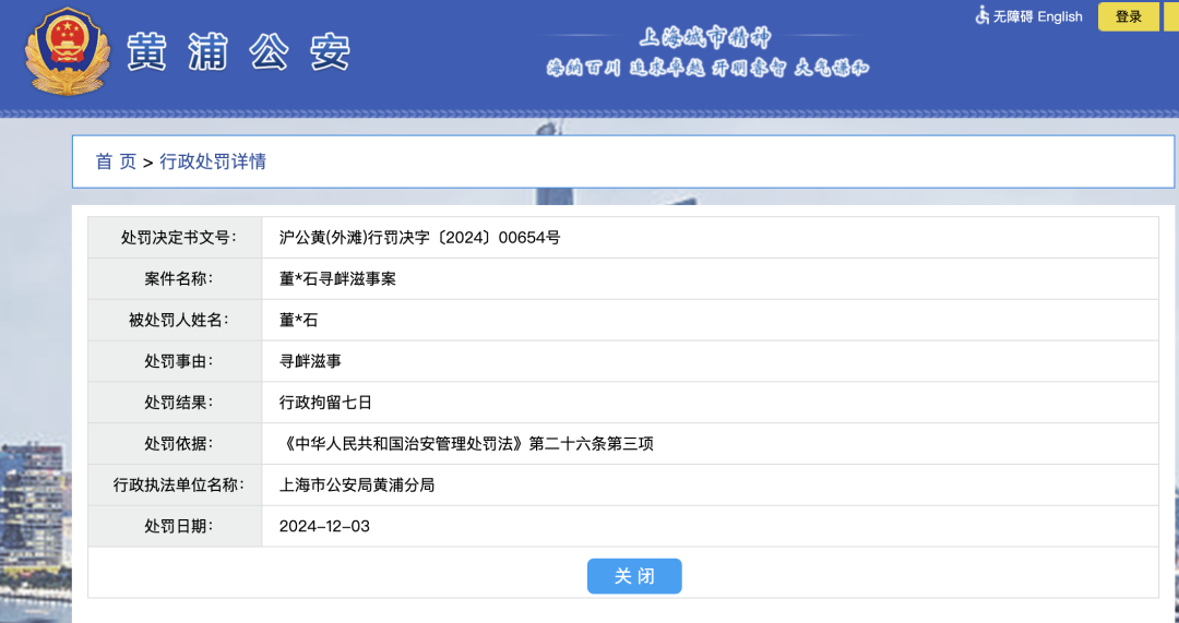 根据上海市公安局黄浦分局公示的行政处罚决定书显示,12月3日,董某石因寻衅滋事被警方处以行政拘留7日的处罚。