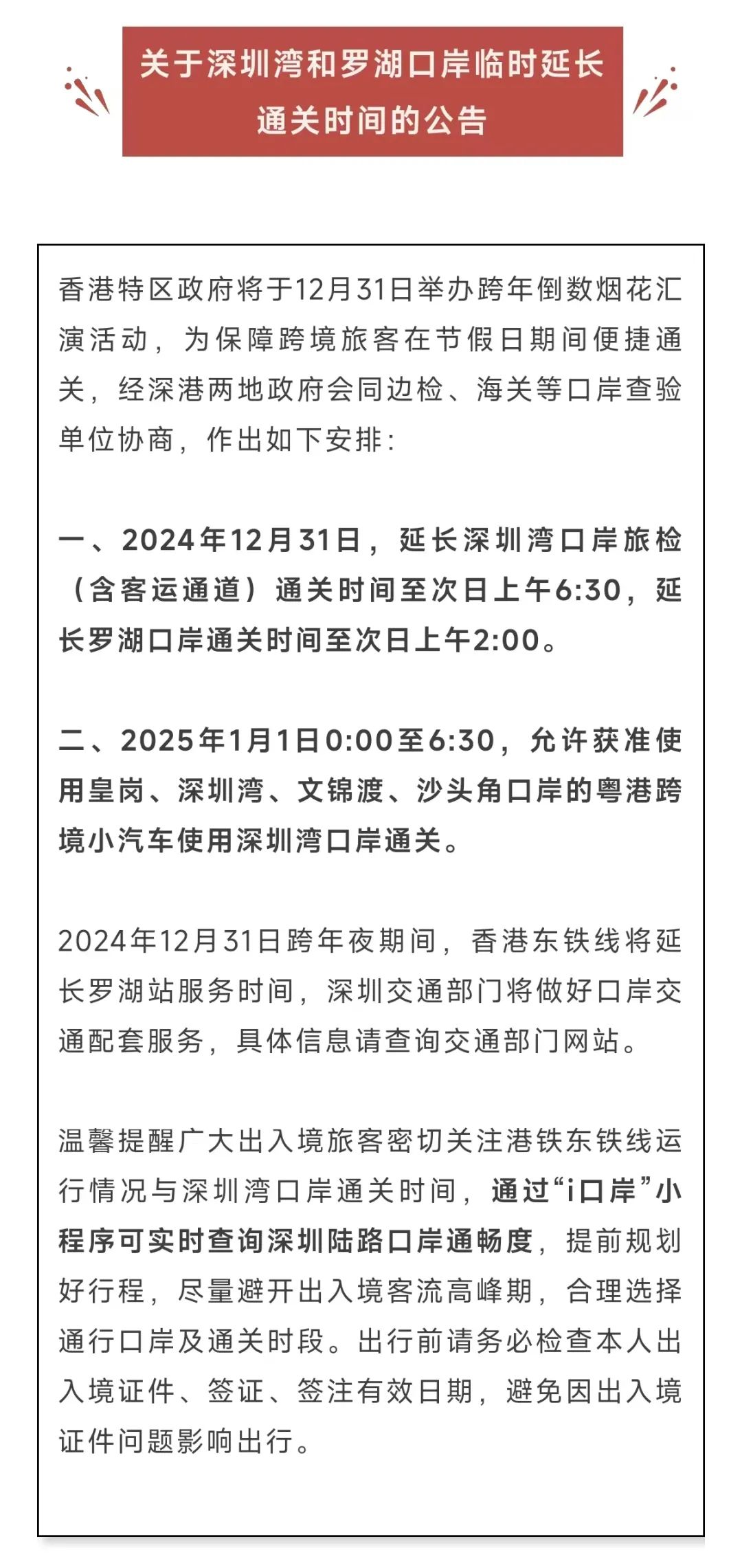 ● 12月31日,深圳湾和罗湖口岸临时延长通关时间。