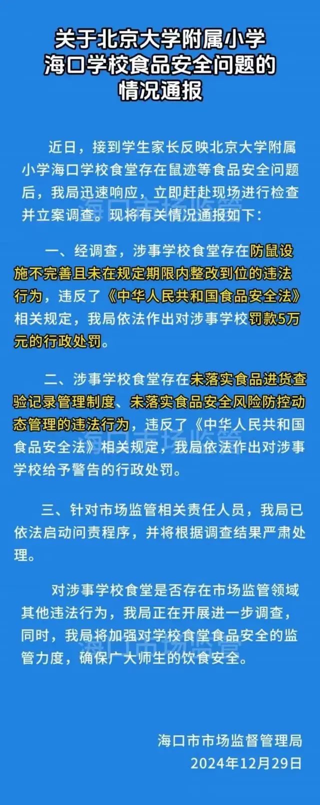 ● 官方通报“北京大学附属小学海口学校食堂存在鼠迹”:罚款5万元,启动问责程序。