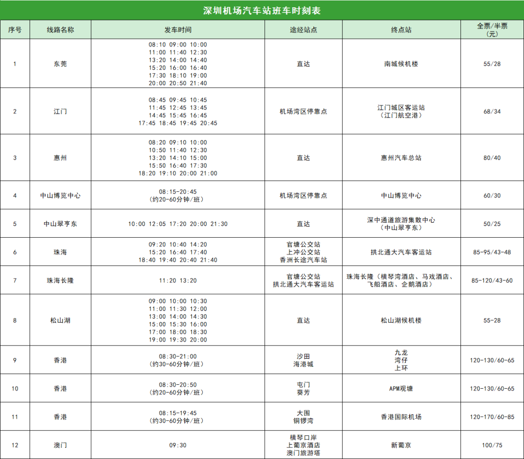 东莞南城、江门、惠州、中山(中山博览中心、深中通道旅游集散中心)、珠海(拱北通大汽车客运站)、珠海长隆(横琴湾酒店、马戏酒店、飞船酒店、企鹅酒店)、松山湖、香港(九龙、湾仔、上环)、香港(APM观塘)、香港(香港国际机场)、澳门(新葡京)