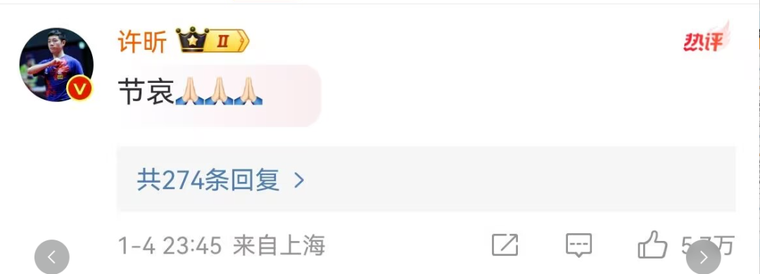 中国男子乒乓球队运动员、世界冠军许昕在这条下留言:“节哀”。