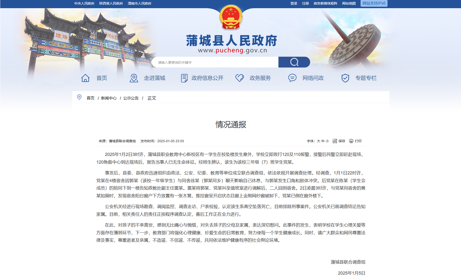 央视网消息:据蒲城县人民政府网站消息,蒲城县联合调查组发布情况通报,2025年1月2日3时许,蒲城县职业教育中心新校区有一学生在校坠楼发生意外,学校立即拨打120及110报警,接警后民警立即赶赴现场,120急救中心到达现场后,宣告当事人已无生命体征。经师生辨认,该生为该校三年级(7)班学生党某。