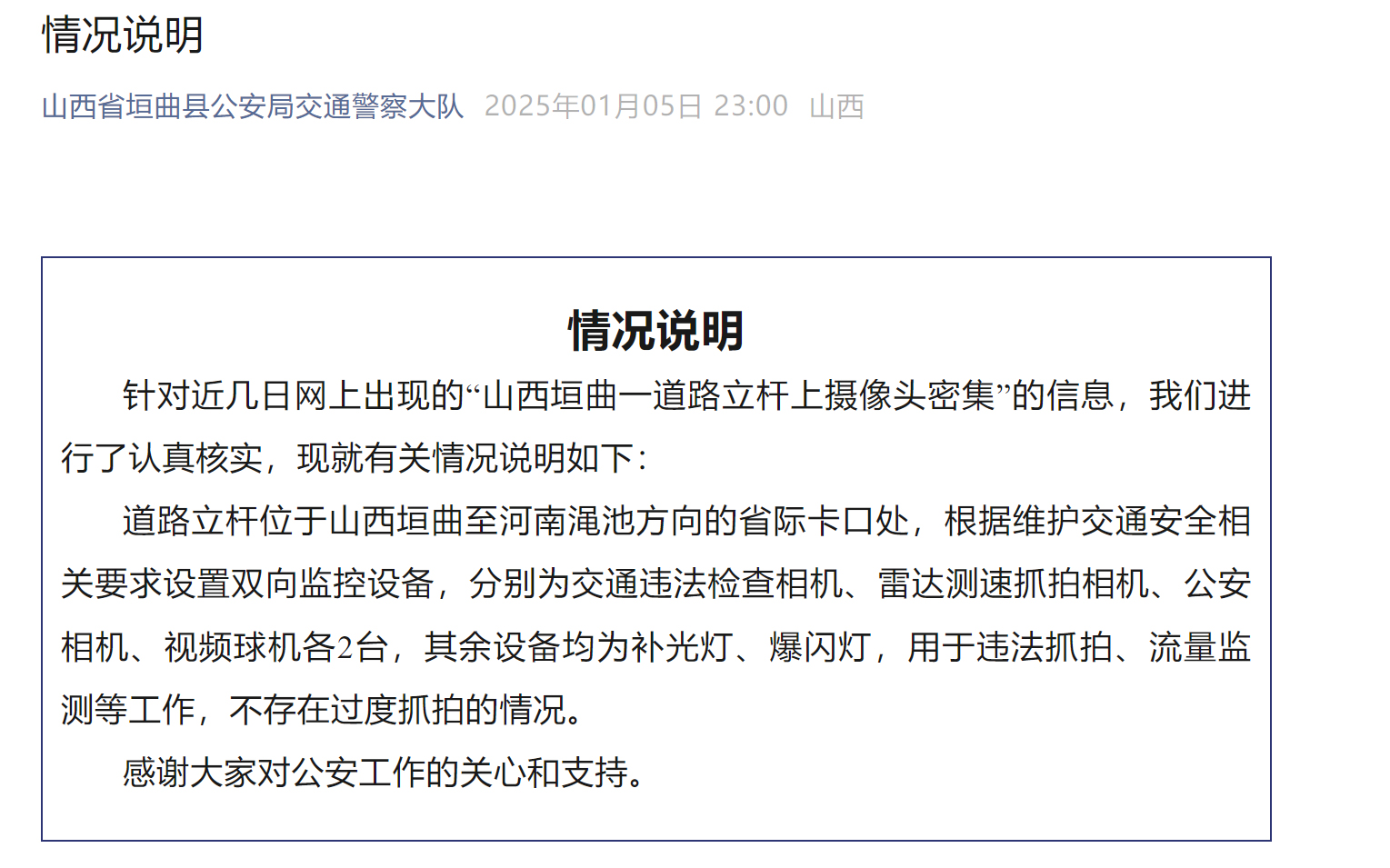 央视网消息:据山西省垣曲县公安局交通警察大队微信公众号消息,针对近几日网上出现的“山西垣曲一道路立杆上摄像头密集”的信息,山西省垣曲县公安局交通警察大队发布情况说明。