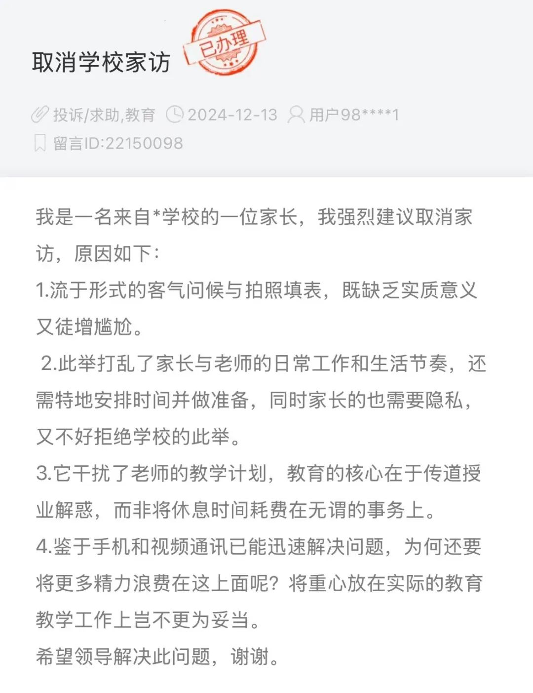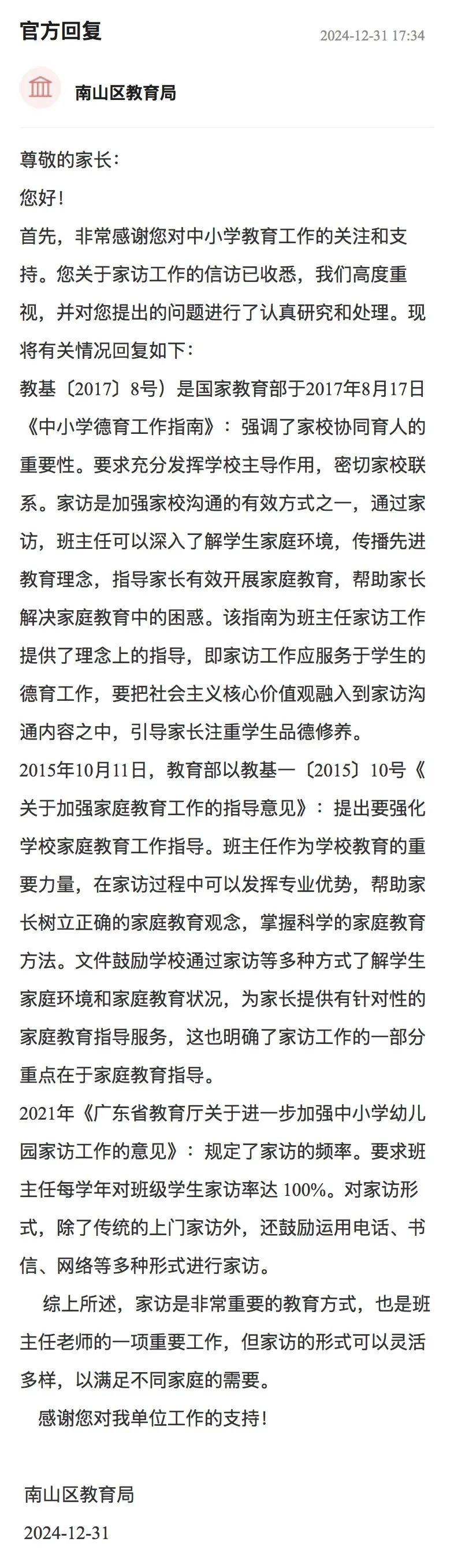 ● 近日,有深圳市民在人民网“领导留言板”发帖称建议取消家访,对此,南山区教育局回应:家访是加强家校沟通的有效方式之一。