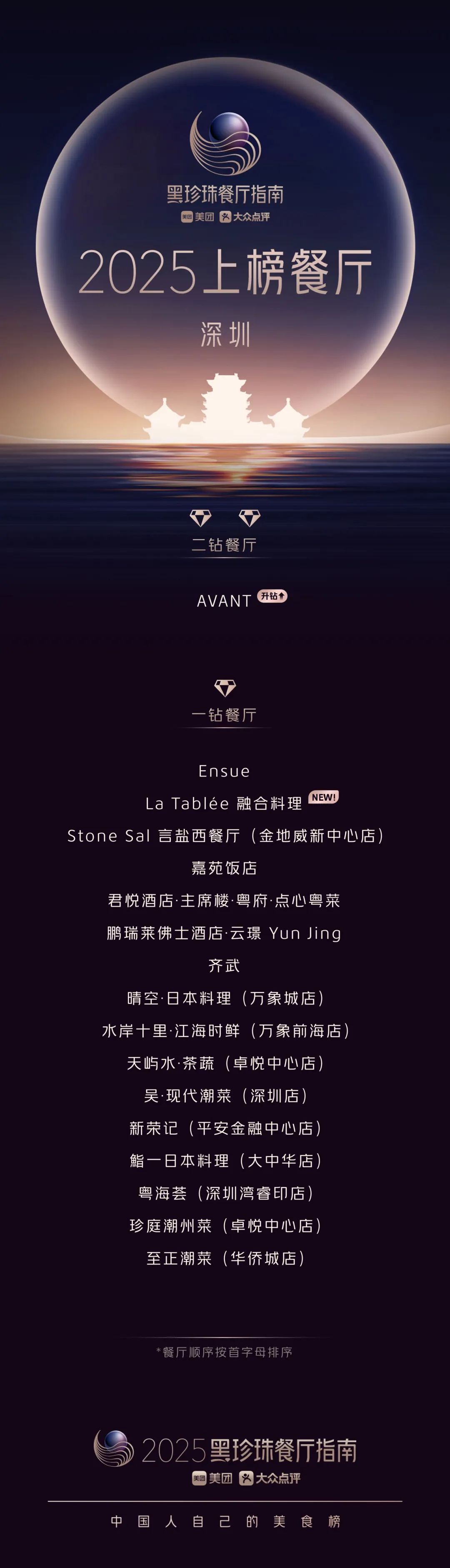 ●近日,2025黑珍珠餐厅指南发布,深圳17家餐厅上榜。其中二钻餐厅1家,一钻餐厅16家,覆盖9个菜系。