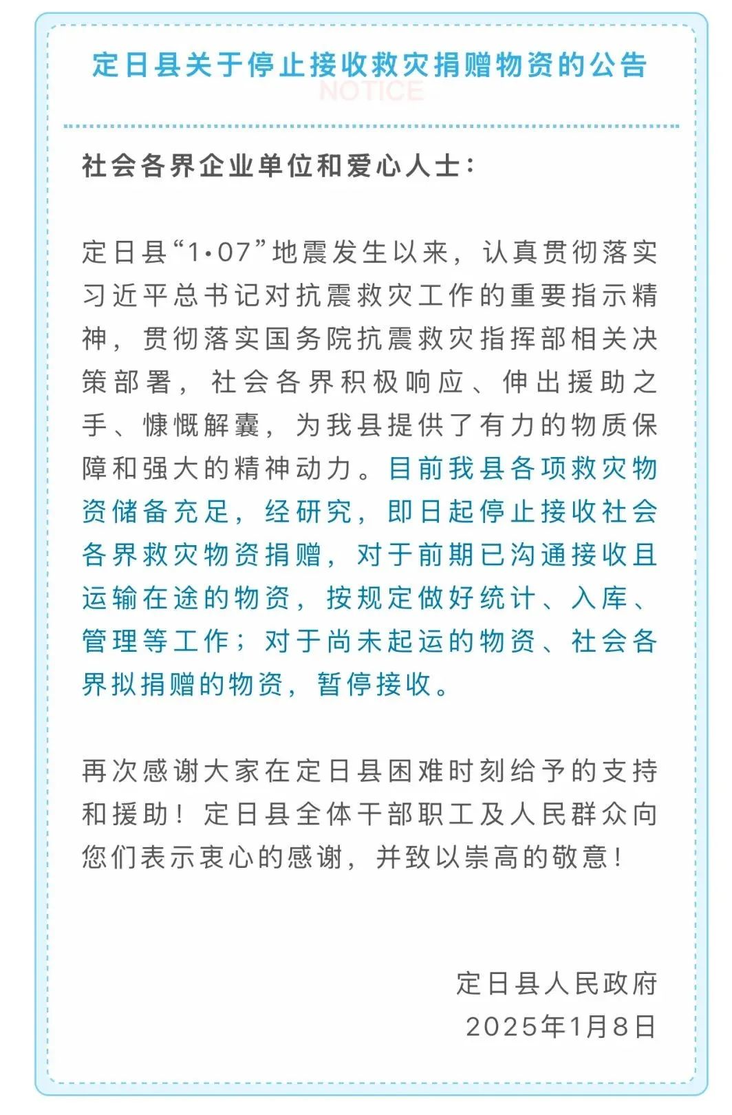 ● 1月8日下午,定日县融媒体中心公众号“珠峰之窗”发布了定日县关于停止接收救灾捐赠物资的公告。