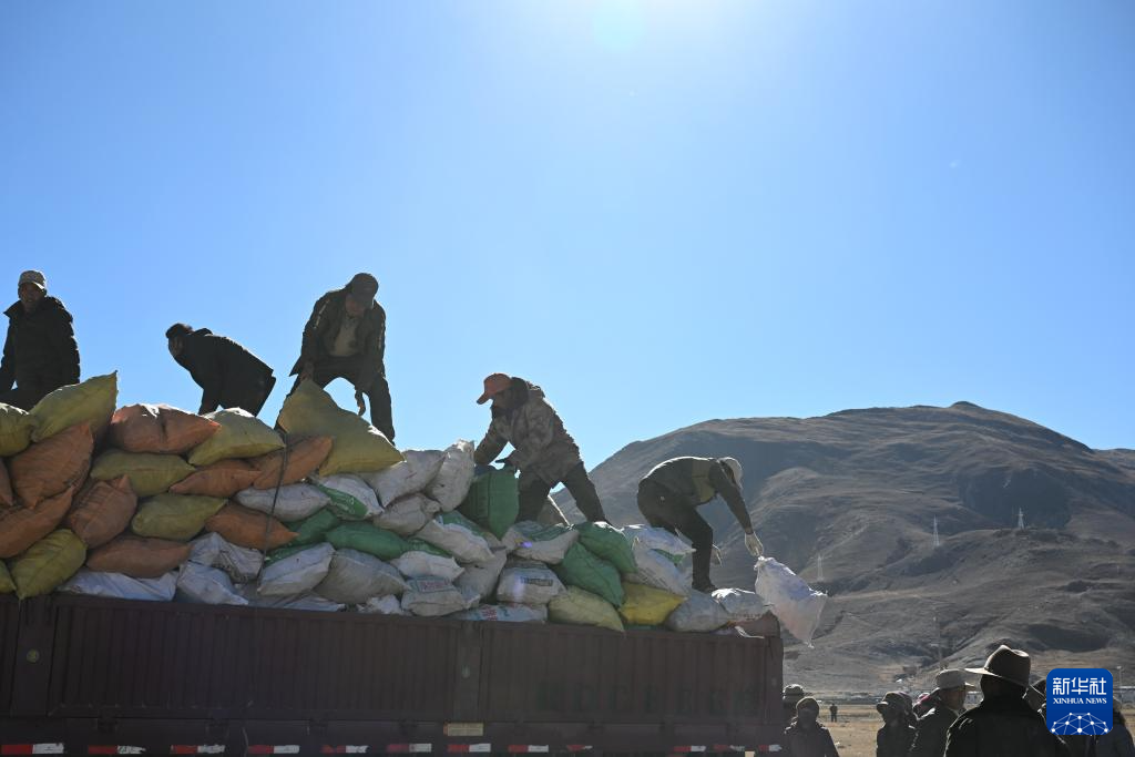 1月9日,受灾群众在措布村卸载救灾物资。