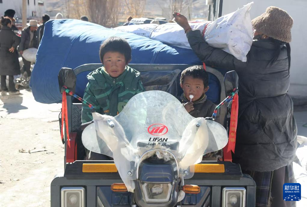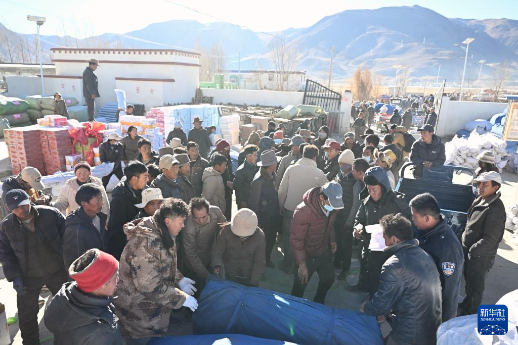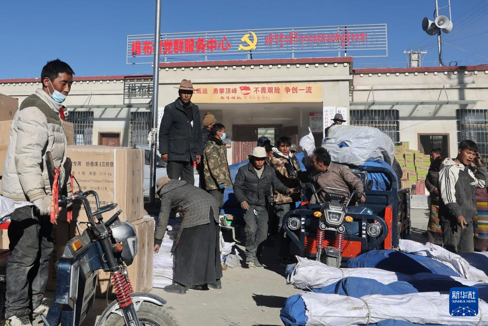 1月9日,受灾群众在措布村村委会领取救灾物资。新华社记者 李响 摄