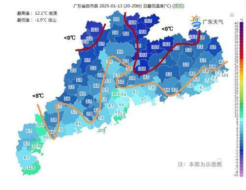 天气实况:12日到13日早晨,全省晴天。白天大部市县最高气温介于17~21℃,其中梅州丰顺国家站录得全省最高气温21.6℃。13日早晨继续受晴空辐射影响,粤北、珠江三角洲北部和云浮等市县出现了0~5℃的低温天气,高海拔山区零下5~0℃,出现了冰冻和霜冻,其余市县5~9℃。