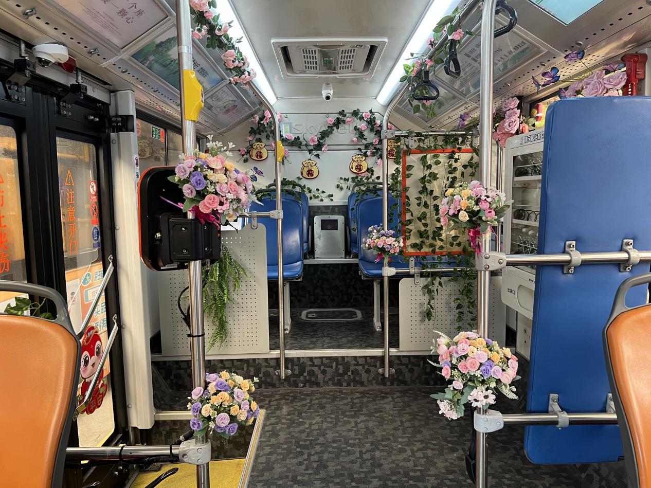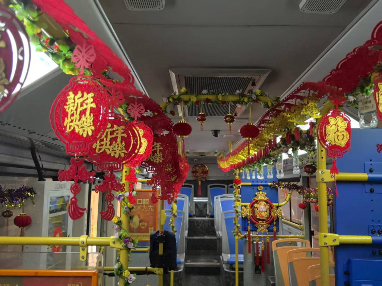 作为迎春花市专线,车厢内精心营造了节日氛围,布置了喜庆祥和的鲜花装饰,象征着喜气盈盈、花开富贵,点亮浓郁喜庆的年味的同时,也让市民提前感受到了春节的仪式感。