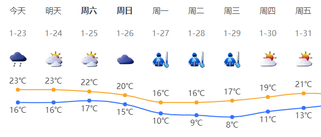 深圳今日分散阵雨转多云,早晚有轻雾;气温16-23℃;东风2-3级;相对湿度50%-95%。