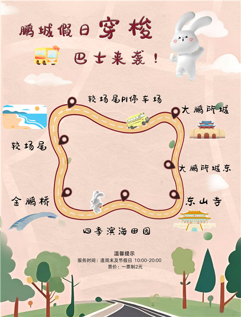 1月18日,鹏城假日穿梭巴士顺利试运营,1月25日起正式运营,服务时间为周末及节假日10:00-20:00,票价2元,为不断提升游客的出行体验和服务质量,后续将结合游客出游需求,动态调整服务时间。