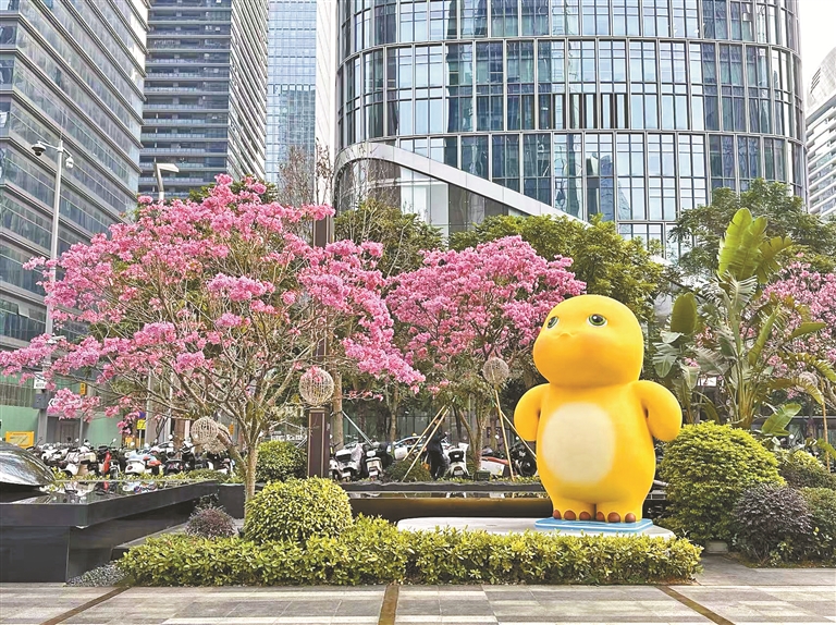 冬日暖阳,在前海鸿荣源中心大楼前的广场上,花团锦簇的风铃木随风摇曳,与一旁高3米的明黄色奶龙相映成趣,这里就是奶龙的“新家”。