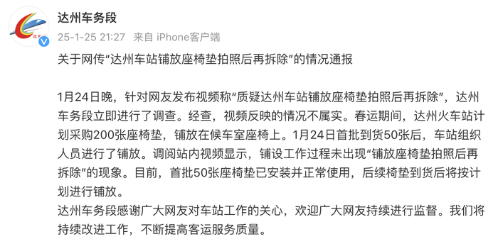 1月25日晚,成都铁路局达州车务段官方微博发布情况通报,回应网传“达州车站铺放座椅垫拍照后再拆除”。