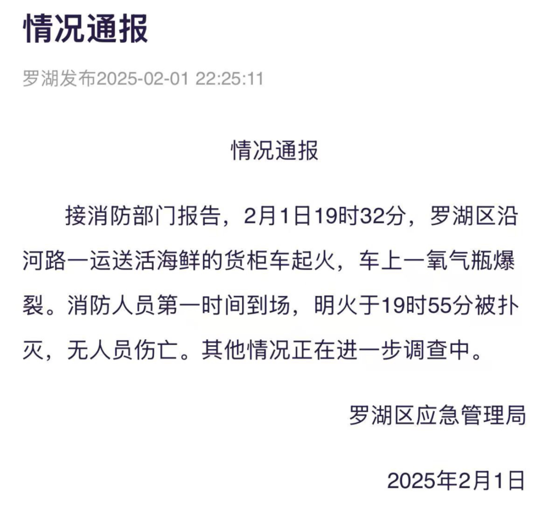 ● 罗湖:日前,罗湖沿河路一运送活海鲜的货柜车起火,车上一氧气瓶爆裂。消防人员第一时间到场将明火扑灭,无人员伤亡。其他情况正在进一步调查中。详情>>