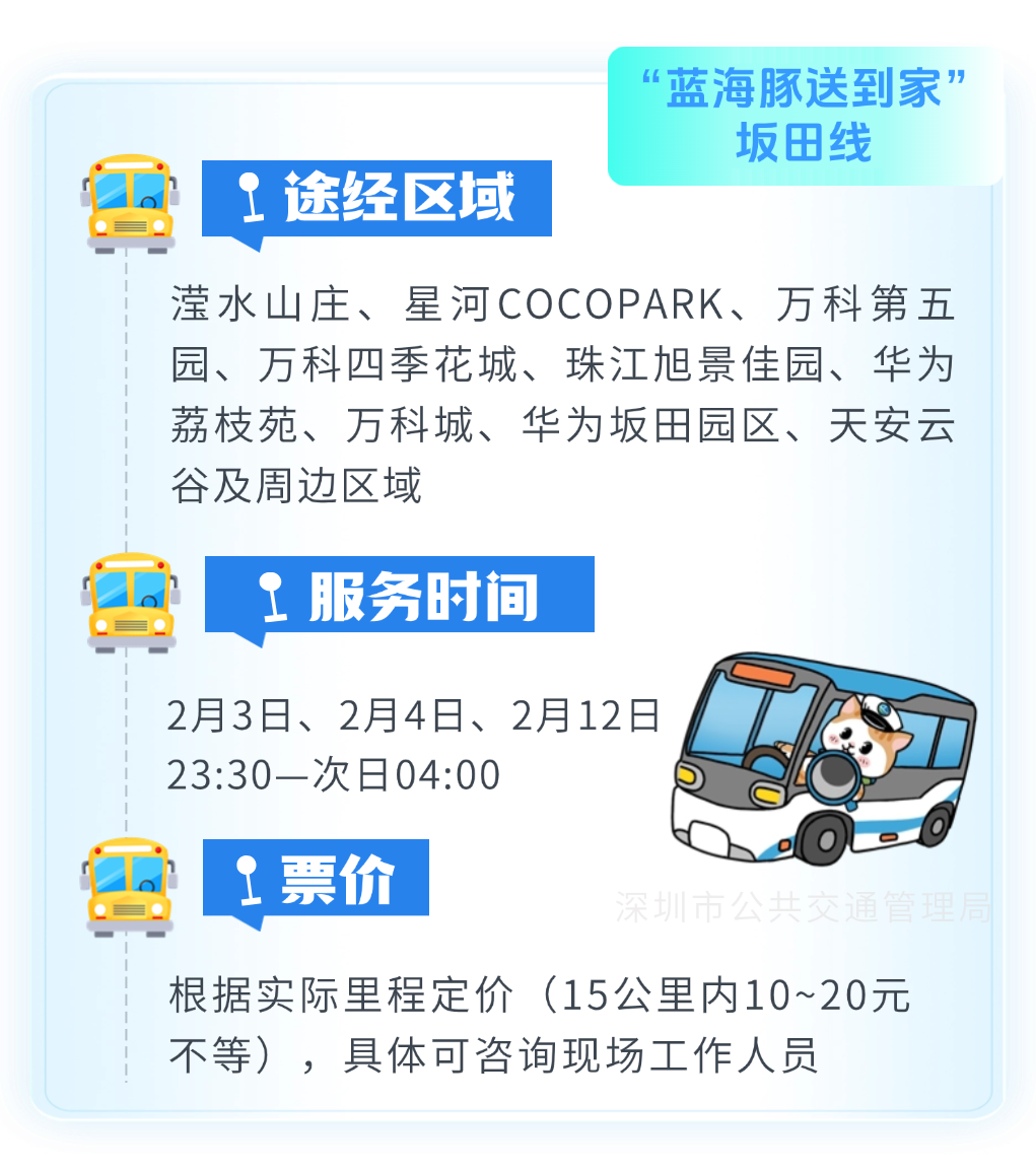● 2月12日23:30-次日04:00,深圳北站将继续推出“蓝海豚送到家”服务,助力夜间抵深旅客顺畅、舒适回家。详情>>