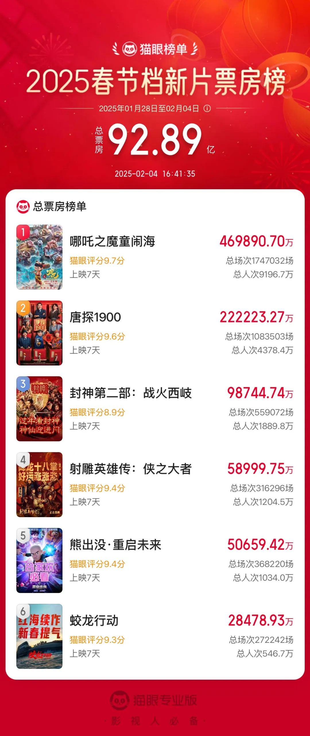 ● 截至2月4日17时,2025年春节档上映新片总票房(含点映及预售)已突破92亿。《哪吒之魔童闹海》《唐探1900》《封神第二部:战火西岐》分列春节档票房榜前三位。