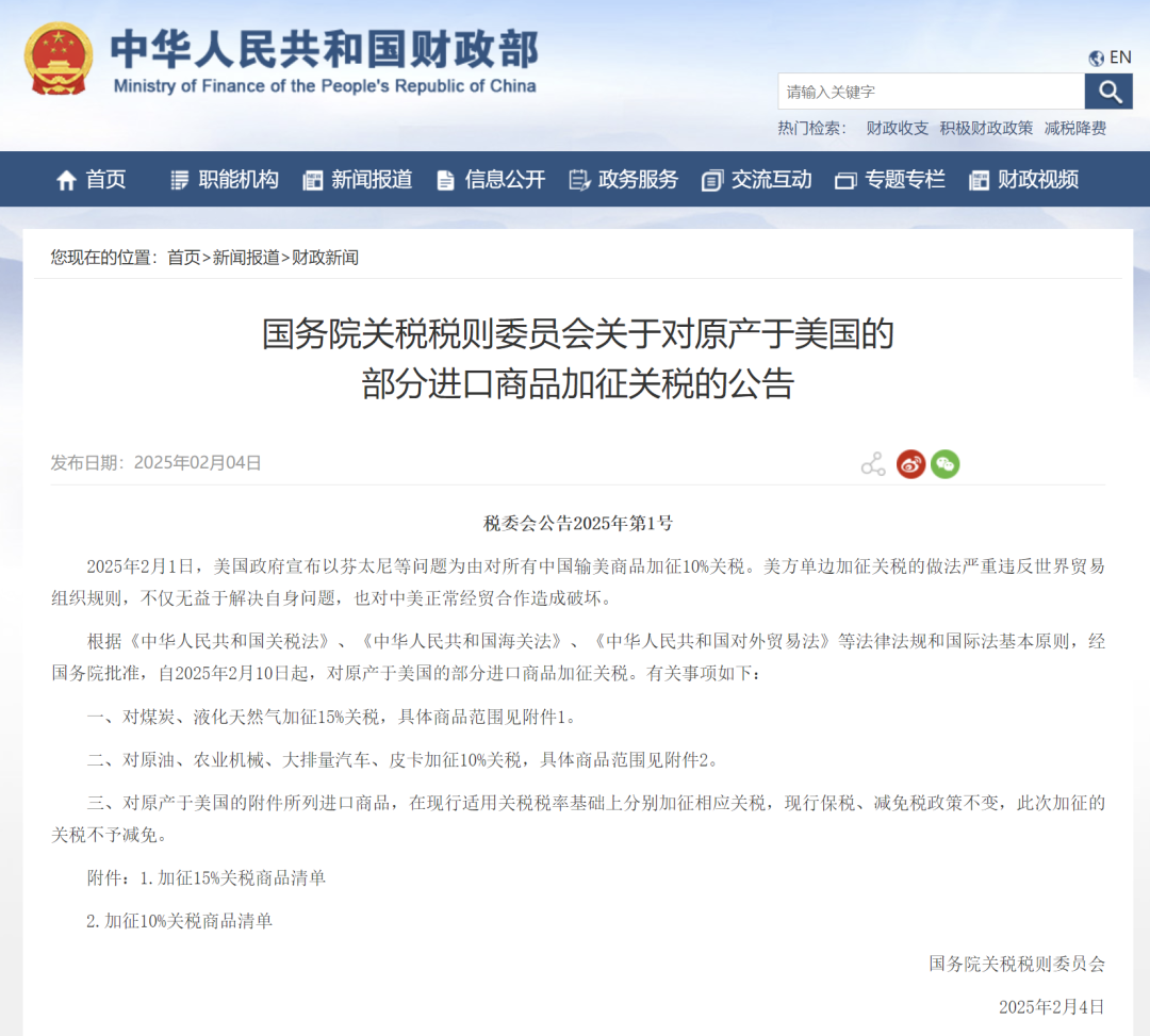 ● 自2025年2月10日起,中国对原产于美国的部分进口商品加征关税。详情>>