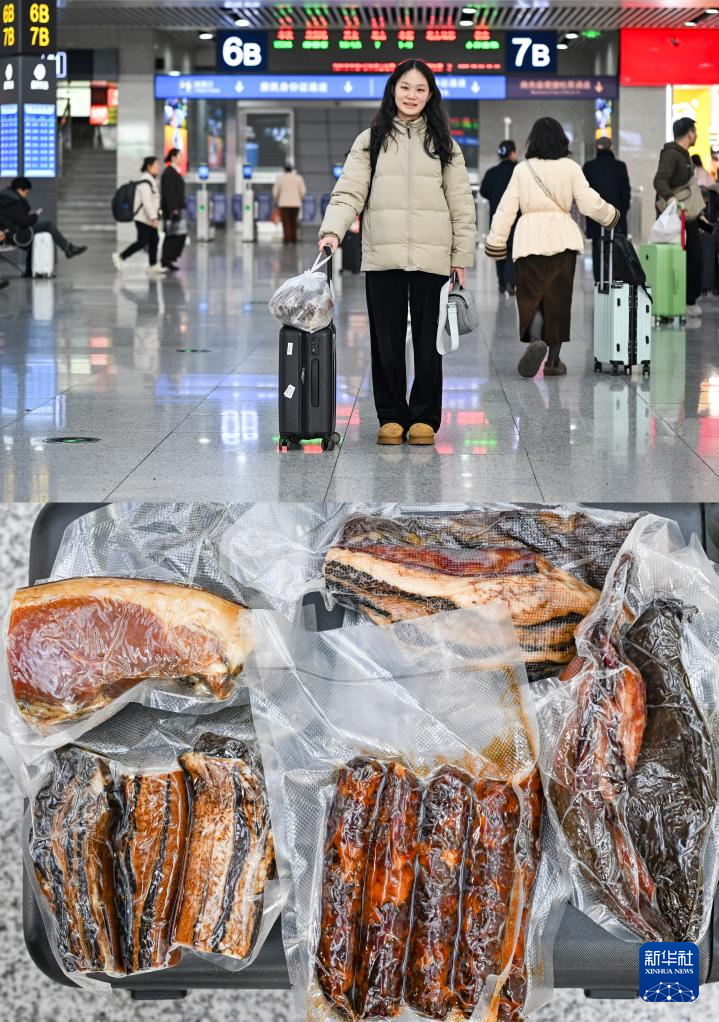 这是一张拼版照片:上图为来自重庆市渝北区仙桃街道的毛靖萱在重庆北站候车,准备返回四川成都工作;下图为她行囊中装着父母为她准备的腊肉、香肠等(2月4日摄)。新华社记者 王全超 摄