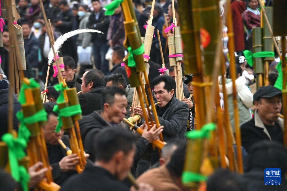 2月5日,人们在融水苗族自治县杆洞乡百鸟衣芦笙坡会上吹芦笙。