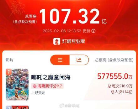 2月6日12时13分,据网络平台数据,《哪吒之魔童闹海》(下称《哪吒2》)总票房(含点映及预售)已超越《长津湖》(57.75亿)票房,位列中国电影票房总榜榜首。