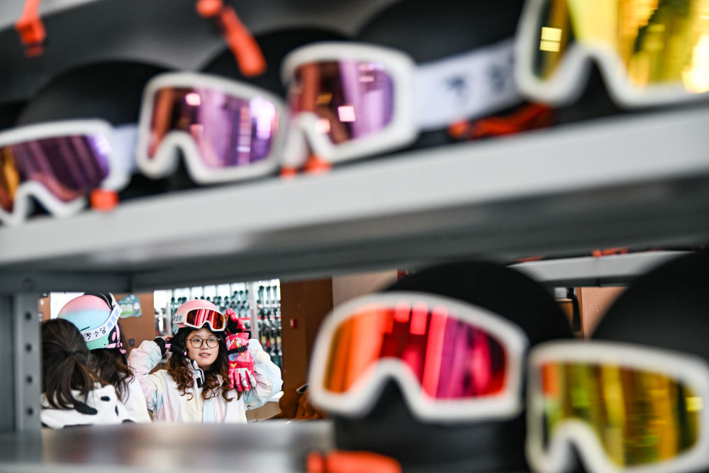 2024年12月27日,滑雪爱好者在四川省阿坝藏族羌族自治州汶川县羌人谷滑雪场租赁滑雪装备。