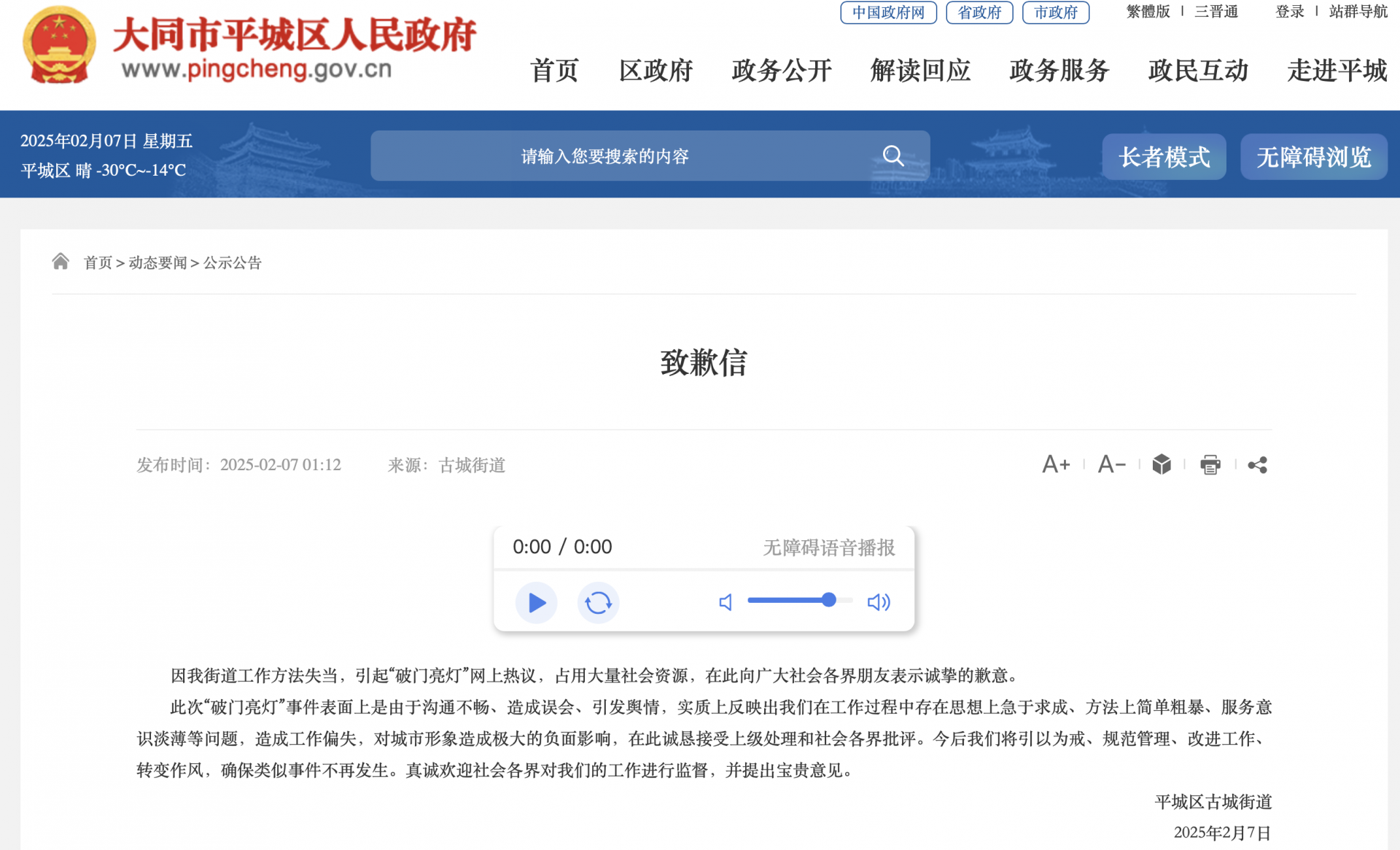 2月7日,山西大同平城区古城街道发布致歉信。致歉信称,因古城街道工作方法失当,引起“破门亮灯”网上热议,占用大量社会资源,在此向广大社会各界朋友表示诚挚的歉意。此次“破门亮灯”事件表面上是由于沟通不畅、造成误会、引发舆情,实质上反映出我们在工作过程中存在思想上急于求成、方法上简单粗暴、服务意识淡薄等问题,造成工作偏失,对城市形象造成极大的负面影响,在此诚恳接受上级处理和社会各界批评。